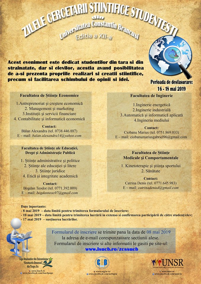 Evenimentul se va încheia pe 18 mai. Sesiunea este dedicată atât studenţilor şi masteranzilor din ţară şi din străinătate, cât şi elevilor. ,,Prin aceste evenimente, dorim să oferim participanţilor posibilitatea de a-şi prezenta activităţile/lucrările lor ştiinţifice în următoarele domenii/secțiuni: Facultatea de Științe ale Educației, Drept și Administrație Publică (Științe administrative și politice, Ştiinţe ale educaţiei și litere, Științe juridice, Etică și integritate academică); Facultatea de Inginerie (Inginerie energetică, Inginerie industrială, Automatică şi informatică aplicată, Ingineria mediului); Facultatea de Ştiinţe Economice (Antreprenoriat şi creştere economică, Management și marketing, Instituții şi servicii financiare, Contabilitate și informatică economică); Facultatea de Științe Medicale și Comportamentale (Kinetoterapie și știinţa sportului, Sănătate)”, au declarat reprezentanții Ligii Studenților din cadrul UCB Târgu-Jiu.Sesiunea Internaţională de Comunicări Ştiinţifice Studenţeşti se bazează pe cercetare, dezbatere şi socializare și este cunoscută pe plan național, dar şi internațional, valorificându-se cercetările studenţilor, masteranzilor, dar şi a elevilor care sunt aşteptaţi să participe cu lucrări. ZCSSUCB este un proiect care are o deschidere mai vastă asupra disciplinelor, implicând domenii din cadrul celor 4 facultăţi din Universitatea ,,Constantin Brâncuşi” din Târgu-Jiu. Ciclul de comunicări științifice studențești oferă participanţilor posibilitatea de a-şi prezenta propriile realizări şi creaţii, valorificarea capacităţii lor creative şi inovatoare, precum şi facilitarea schimbului de opinii şi idei. Prin participarea la cea de-a XII-a ediţie a ZCSSUCB, urmare a procesului de recenzare efectuat de comitetul ştiinţific constituit, studenţii, masteranzii și elevii înregistraţi vor avea posibilitatea de a li se publica studiile elaborate în volumul ZCSSUCB 2019 (condiţiile de tehnoredactare trebuie respectate).