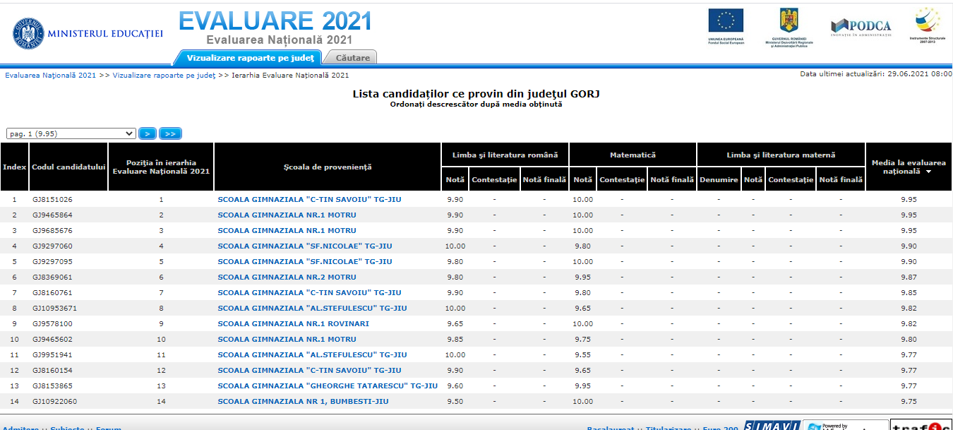 Primele rezultate obținute de candidații care au susținut Evaluarea Națională au fost publicate în această dimineață. La nivelul județului Gorj, nu s-a înregistrat nicio medie de 10. Cea mai mare medie este 9,95 și a fost obținută de trei candidați, unul de la Școala Gimnazială ”Constantin Săvoiu” Târgu-Jiu și doi de la Școala Gimnazială Nr. 1 Motru.
