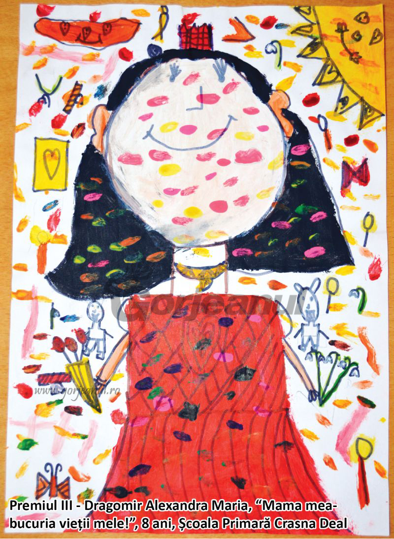 Premiul I a fost adjudecat de Mirea Oana-Gabriela (15 ani), din satul Vlăduleni, comuna Bîlteni, cu lucrarea “Dragoste de mamă”. Premiul II a revenit elevei Popescu Marina Alexandra (14 ani), de la Școala Gimnazială “Gheorghe Tătărăscu” Târgu-Jiu, pentru lucrarea “Iubirea de mamă nu are limite”, iar Premiul III a fost acordat elevei Dragomir Alexandra Maria (8 ani), de la Școala Primară Crasna Deal, pentru lucrarea “Mama mea – bucuria vieții mele!”. De asemenea, s-a mai decis acordarea unui Premiu Special, constând în publicarea lucrării pe prima pagină a cotidianului “Gorjeanul”, elevei Dogaru Alexandra (9 ani), de la Școala Gimnazială “Prof. Nicolae Caranda” Glogova. Reamintim că, potrivit regulamentului, evaluarea lucrărilor s-a făcut ținându-se cont de următoarele criterii: originalitate, claritatea mesajului transmis, încadrarea în specificul concursului, respectarea convențiilor de realizare a unui desen, aspectul estetic și stilistic, precum și unitatea compoziției.