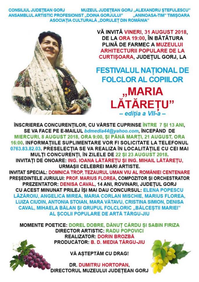 Tinerii talentaţi, care iubesc folclorul, sunt aşteptaţi să se înscrie la o nouă ediţie a Festivalului Naţional de Folclor al Copiilor „Maria Lătăreţu”. Preselecţiile vor avea loc în localităţile cu cei mai mulţi concurenţi înscrişi, în zilele de 22 şi 23 august. Festivalul va avea loc pe 31 august, în cadrul de poveste oferit de Muzeul Arhitecturii Populare de la Curtişoara, judeţul Gorj. Invitaţi de onoare ai evenimentului vor fi doi urmaşi ai celebrei artiste, Ioana Lătăreţu şi Mihail Lătăreţu. La festival va fi prezent şi un invitat special: Domnica Trop, considerată tezaurul viu al folclorului românesc.