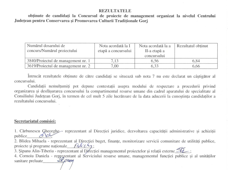 Doi candidați, niciun admis! Consiliul Județean Gorj a organizat un concurs de proiecte de management pentru postul de director al Centrului Județean pentru Conservarea și Promovarea Culturii Tradiționale Gorj, instituție de cultură aflată în subordinea sa.