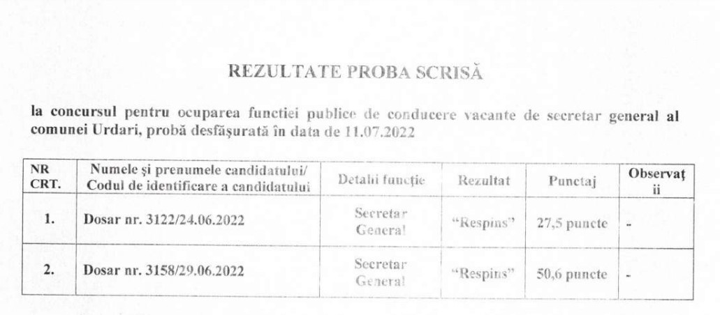 Concurs reluat la Primăria Urdari pentru ocuparea postului de secretar general. Cei doi candidați care s-au înscris la examenul organizat luna trecută au picat cu brio proba scrisă. Unul dintre participanți nu a reușit să ia nici măcar nota 3. Primăria are nevoie de un om bine pregătit, secretarul general fiind cel care avizează proiectele de hotărâri şi contrasemnează pentru legalitate dispozițiile primarului și hotărârile consiliului local.