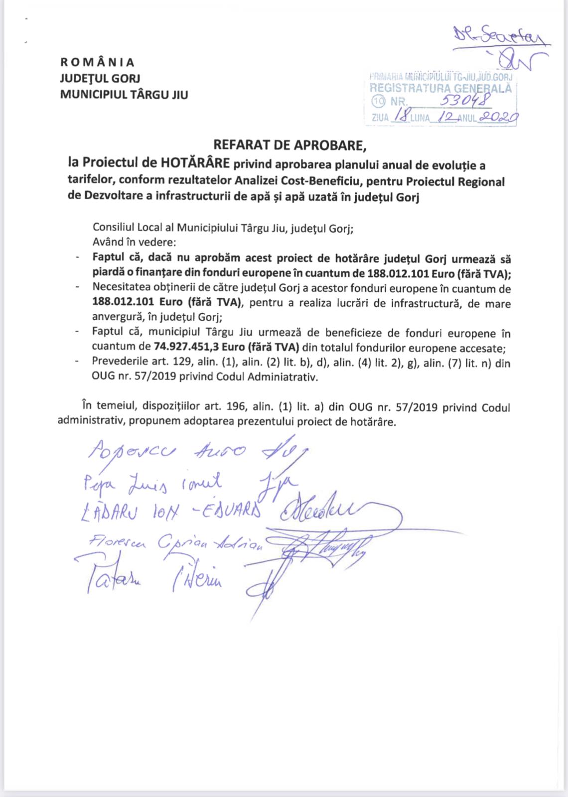 ,,Aceste fonduri europene vor fi folosite pentru dezvoltarea infrastructurii de apă și apă uzată din județul Gorj, dar și din municipiul Târgu-Jiu. În același timp, tot prin această hotărâre a fost aprobat planul anual de evoluție a tarifelor pentru perioada 2020 – 2026, conform rezultatelor analizei cost-beneficiu pentru „Proiectul regional de dezvoltare a infrastructurii de apă și apă uzată din județul Gorj”, plan ce va intra în vigoare începând cu data semnării programului de finanțare.