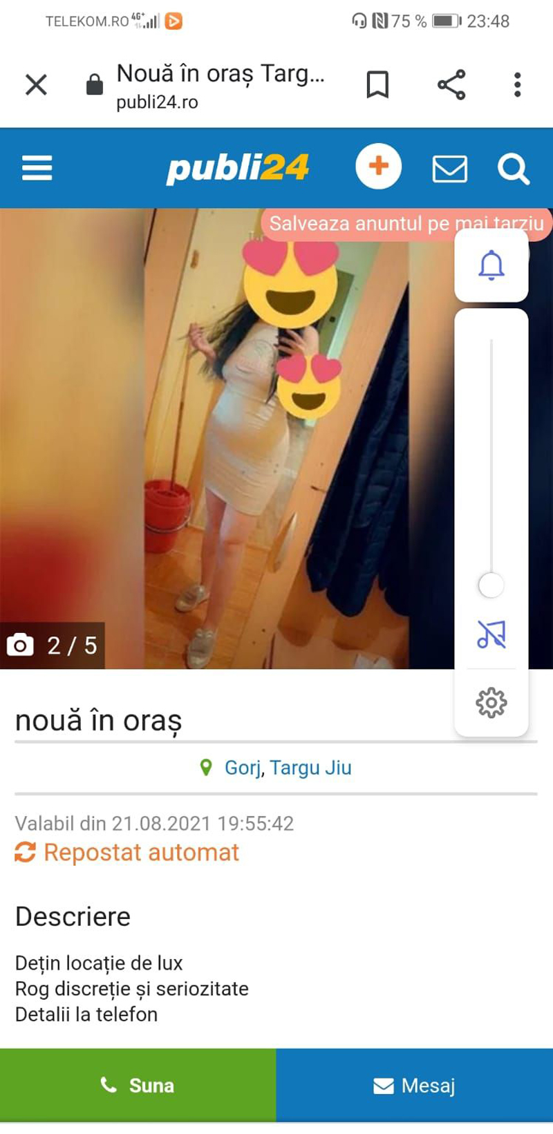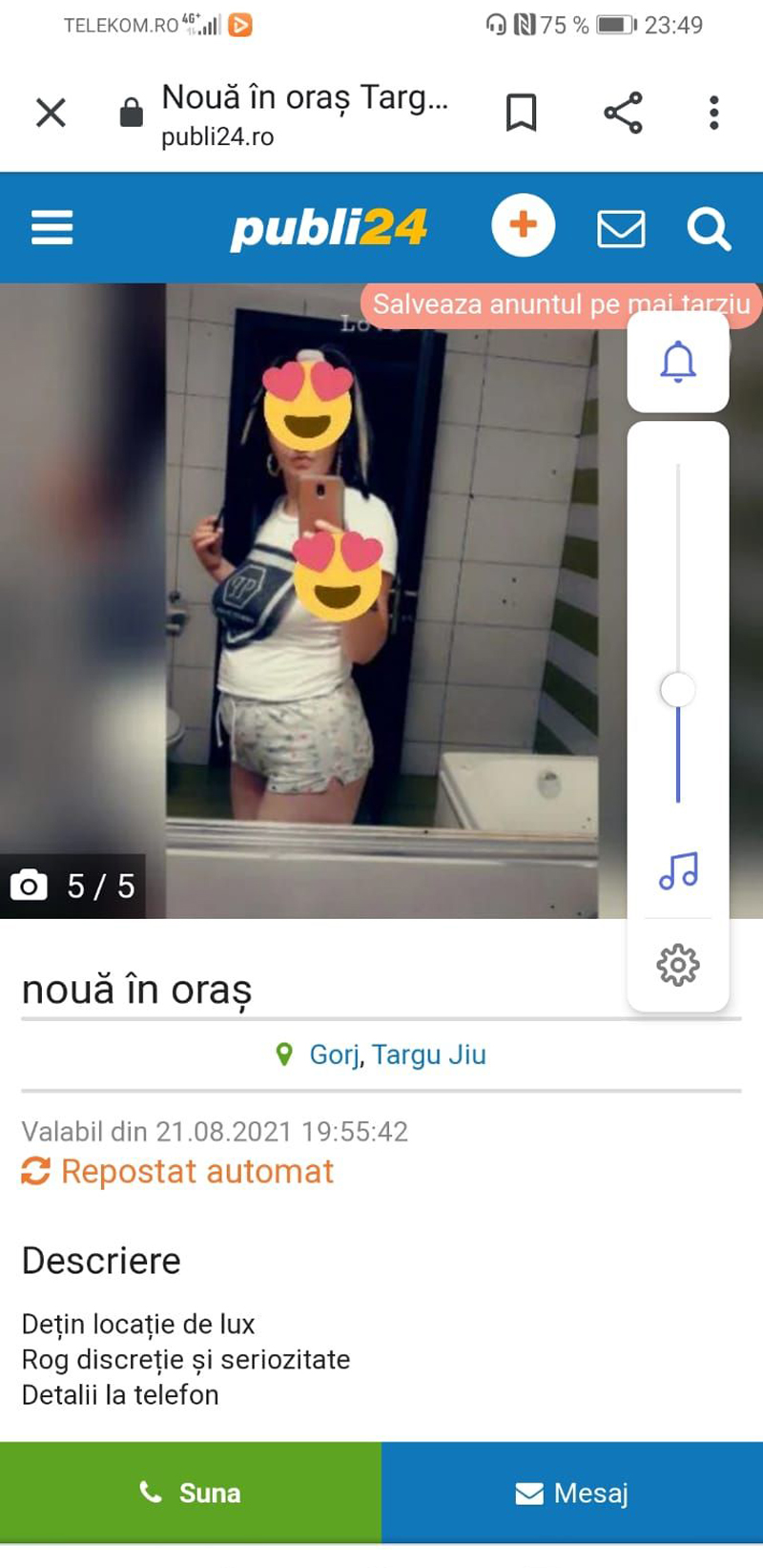 O femeie de 29 de ani, mama unei fetițe în vârstă de 7 ani din Târgu-Jiu, a fost dată în judecată de soțul cu care se află în divorț pentru decăderea din drepturile părintești. Soțul își acuză partenera de viață că ar face prostituție pe site-uri specializate, atât în Gorj, cât și în Dolj, iar prezența ei într-un clan mafiot ar pune în pericol viața minorei, fetița fiind în grija mamei, mai exact a bunicilor materni. Procesul se află pe rolul Judecătoriei Târgu-Jiu, sentința rămânând, vineri, în pronunțare. Acuzele soțului la adresa celei cu care este căsătorit de opt ani de zile sunt grave, aceasta fiind acuzată că are un ,,pește’’ care îi ia banii obținuți din prostituție, clienții fiind racolați pe publi24.ro.