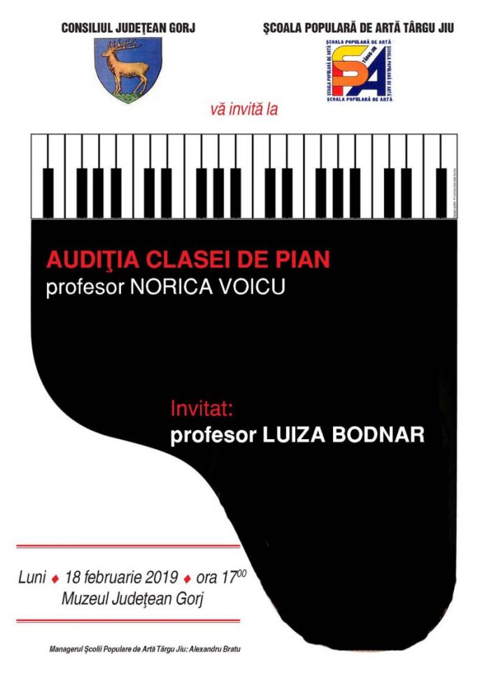Școala Populară de Artă Târgu-Jiu reorganizează astăzi, de la ora 17.00, Audiția clasei de pian, prof. Norica Voicu. Cursanții clasei de pian vor prezenta în fața publicului fragmente muzicale ce vor scoate în evidență cunoștințele acumulate în studiul pianului pe parcursul acestui semestru. ȘPA Târgu-Jiu acordă o mare importanță încurajării cursanților săi în arta cântatului în public la instrumente sau cu vocea. Invitați în cadrul acestei audiții vor fi și o parte dintre cursanții doamnei prof. Luiza Bodnar. Manifestarea se va desfășura la sediul Muzeului Județean Gorj “Alexandru Ștefulescu”. Intrarea este liberă!