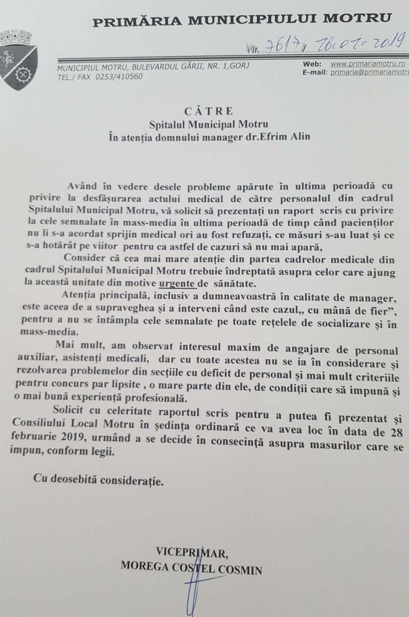 În adresa trimisă Spitalului Motru, viceprimarul cere explicații conducerii unității medicale, reamintindu-le, totodată, celor implicați în buna desfășurare a actului medical că prioritară este viața cetățenilor, asigurarea unui act medical corespunzător și adecvat cât și mai mult respect față de cei ce ajung la această unitate spitalicească, deoarece bolnavii ajung la spital nu de drag, ci de nevoie.