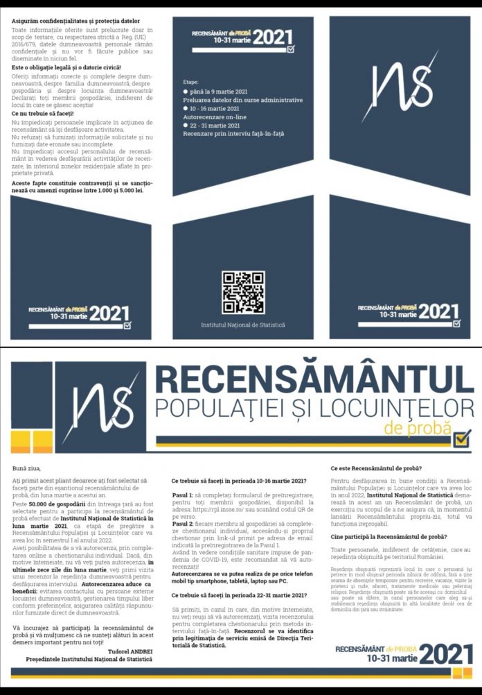 Pasul 2: fiecare membru al gospodăriei să completeze chestionarul individual, accesându-și propriul chestionar prin link-ul primit pe adresa de email indicată la preînregistrarea de la Pasul 1. Având în vedere condițiile sanitare impuse de pandemia de COVID-19, este recomandat să vă autorecenzați! Autorecenzarea se va putea realiza de pe orice telefon mobil tip smartphone, tabletă, laptop sau PC”, a transmis conducerea Direcției Județene de Statistică Gorj.