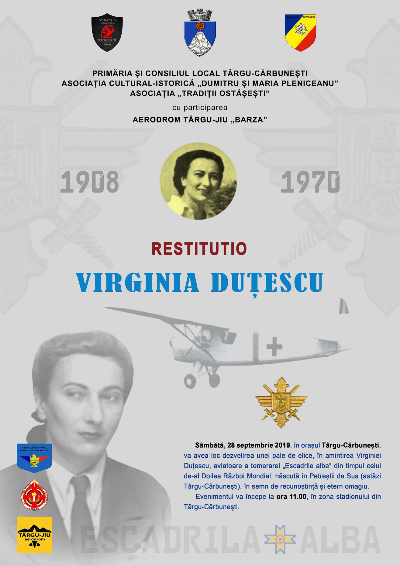 Sâmbătă, 28 septembrie 2019, în orașul Târgu-Cărbunești, va avea loc dezvelirea unei pale de elice, în amintirea Virginiei Duțescu, aviatoare a temerarei „Escadrile albe” din timpul celui de-al Doilea Război Mondial, născută în Petreștii de Sus (astăzi Târgu-Cărbunești), în semn de recunoștință și etern omagiu. Evenimentul va începe la ora 11.00, în zona stadionului din Târgu-Cărbunești.