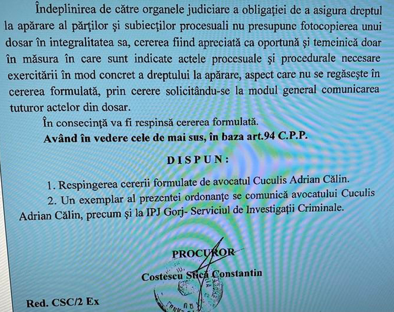 De ce spun că este mușamalizat? Fiindcă am făcut sute de cereri de acces la dosare și nu mi-a fost refuzat niciodată accesul. DE CE? Pentru că este ilegal și este și mai ilegal să ți se refuze accesul, bazând-te pe argumentele pe care le vedeți scrise de către un procuror care citește procedura penală din 2 în 2. Am făcut cererea către ICCJ, măcar de s-or sesiza să preia dosarul în București. Pasul următor este strămutarea. Au început frământarea și „viermuială” fiindcă știu că voi detona acel dosar.”, a fost, ieri, mesajul lui Adrian Cuculis.
