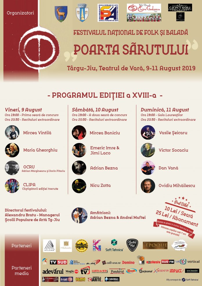 Astăzi 9 august, începe Festivalul Național de Folk și Baladă „Poarta Sărutului”, ediția a XVIII-a. Evenimentul are loc în perioada 9-11 august, în incinta Teatrului de Vară din Târgu Jiu și se va desfășura sub formă de spectacol.