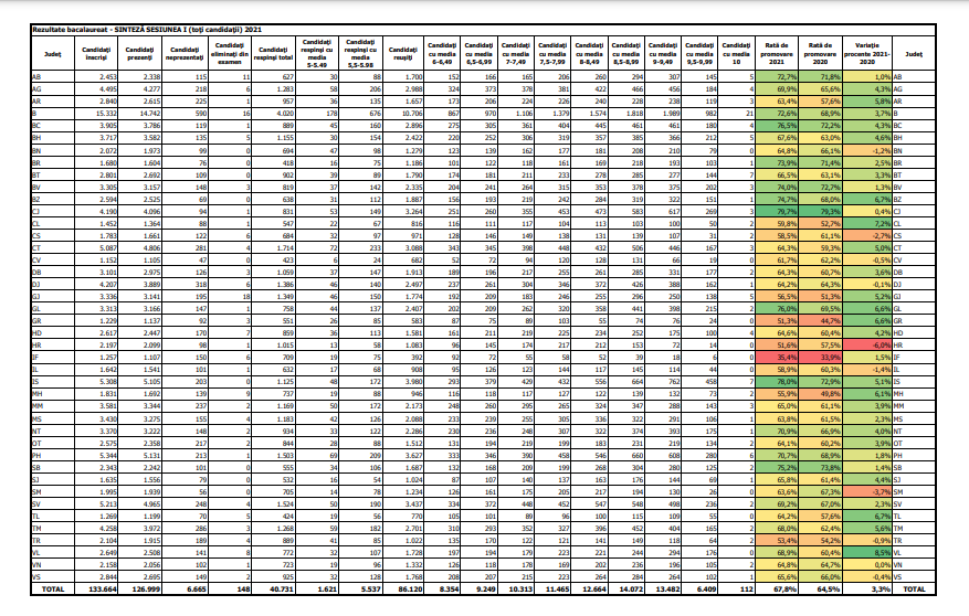 Ministerul Educației a anunțat că, la nivel național, rata cumulată de promovare (înainte de contestații) este de 67,8% (în creștere cu aproape 5% față de aceeași etapă de afișare din sesiunea iunie-iulie a anului trecut: 62,9%). Pentru promoția curentă, rata de promovare este 73,9% (un plus de 2,5%, comparativ cu aceeași etapă din sesiunea iunie-iulie 2020: 71,4%), iar pentru promoțiile anterioare, 27,6% (o majorare de 2,6%, comparativ cu sesiunea iunie-iulie 2020: 25%). Au promovat 86.120 de candidați, dintr-un total de 126.999 de candidați prezenți (110.358 de candidați prezenți provin din promoția curentă, respectiv 16.641 de candidați prezenți din promoțiile anterioare). 112 candidați au obținut media 10 (232, în prima sesiune a anului trecut, înainte de contestații). Pe discipline de examen, situația candidaților cu note de 10 este următoarea: Limba și literatura română: lucrările a 1.351 de candidați au fost notate cu 10; Limba și literatura maternă: lucrările a 263 de candidați au fost notate cu 10; proba obligatorie a profilului (Matematică – 948; Istorie – 1.766); proba la alegere a profilului și a specializării: 7.196 (cele mai multe note de 10 au fost obținute la Logică și argumentare: 1908).