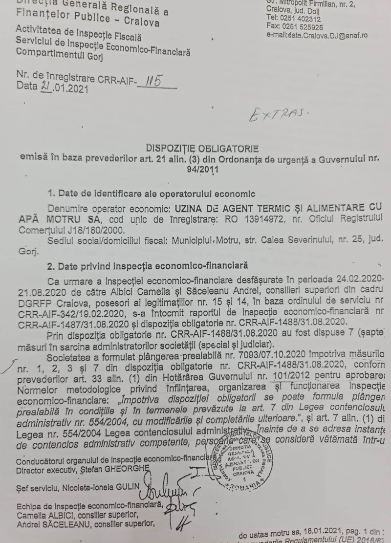 Acum, UATAA încearcă, prin mai multe notificări făcute primăriei din Motru, să solicite ca cei 60.000 de lei, prejudiciul adus societății de către Corcoață, să fie plătiți de UAT.
