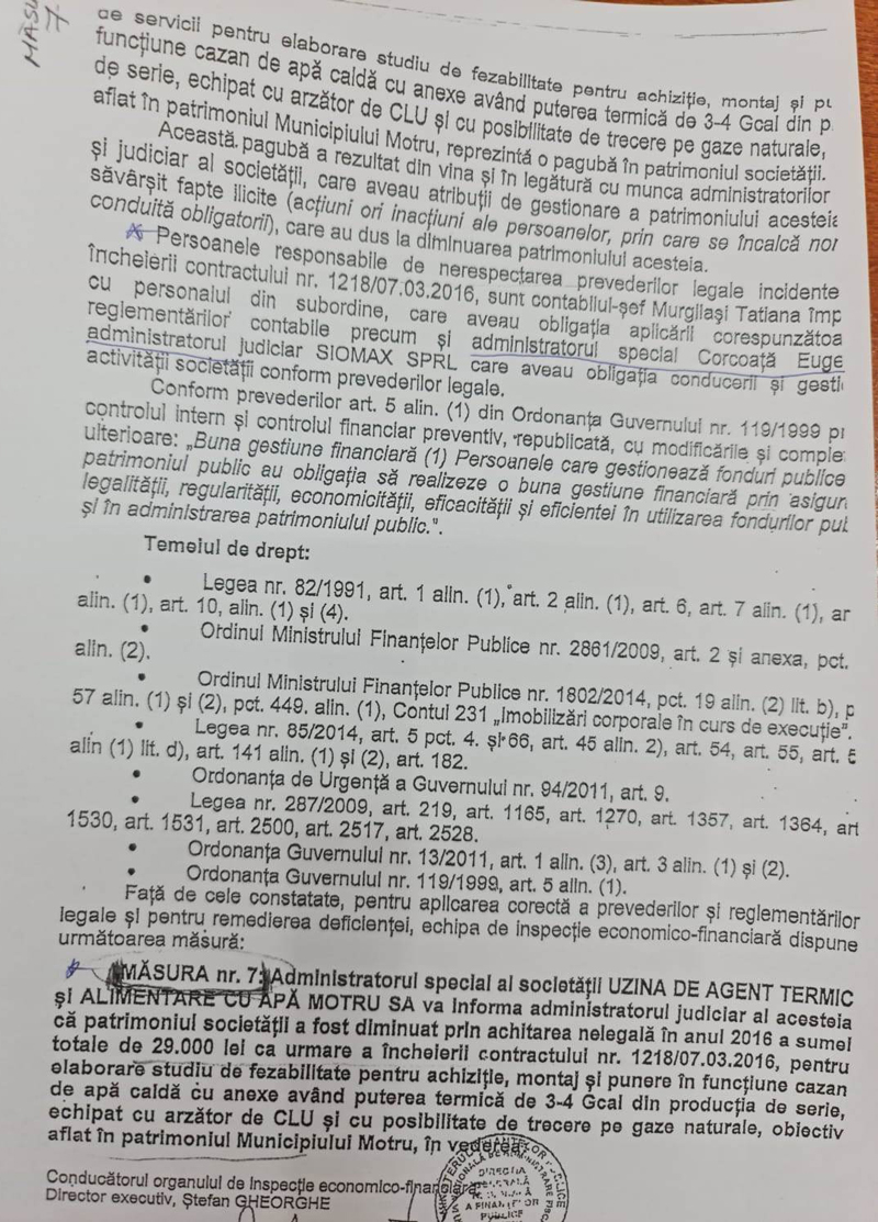 Îi reamintim însă, lui Corcoață, că în 2021, Administrația Națională Fiscală a emis o dispoziție obligatorie către UATAA, în urma unui control efectuat în anul 2020. Pe lângă multe alte nereguli, s-a constatat atunci faptul că UATAA, aflată în insolvență la acea vreme, a elaborat un studiu de fezabilitate pentru achiziție, montaj și punere în funcțiune a unui cazan de apă caldă, cu o putere termica de 3-4 gigacalorii. Este vorba despre un cazan echipat cu un arzător de CLU și cu posibilitate de trecere pe gaze naturale, care nu a funcționat niciodată la parametri normali, fiind subdimensionat pentru instalațiile de distribuție a agentului termic. Pentru acesta, statul a finanțat cu o sumă importantă (peste 9 miliarde). Cu toate acestea, Finanțele, scriu negru pe alb, că studiul reprezintă o pagubă în patrimoniul societății. Paguba a rezultat din vina și în legătură cu munca administratorilor societății care aveau atribuții de gestionare a patrimoniului acesteia. Respectivii au săvârșit fapte ilicite, care au dus la diminuarea patrimoniu UATAA.