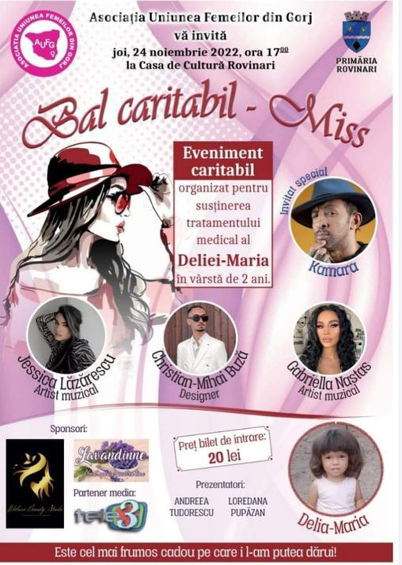 Astfel, balul caritabil va avea loc la Rovinari, în data de 24 noiembrie, la Casa de Cultură, acolo unde vor cânta pe scenă mai mulți artiști îndrăgiți, printre care și Kamara sau Jessika Lăzărescu. ,,Pe 24 noiembrie, ora 17, ne întâlnim la Casa de Cultură Rovinari, să redăm speranța unei mici prințese, încercată de viață mult prea timpuriu. Pentru Delia, AUFG, în parteneriat cu Primăria Rovinari, organizează un bal caritabil iar banii obținuți în urma acestuia, vor fi donați familiei Deliei. Puteți achiziționa bilete si de la noi, de la Lavandinne Store în Târgu Jiu, dar și de la Loredana Pupăzan sau Andreea Tudorescu. Biletele sunt în limita locurilor disponibile”, a transmis Asociația.