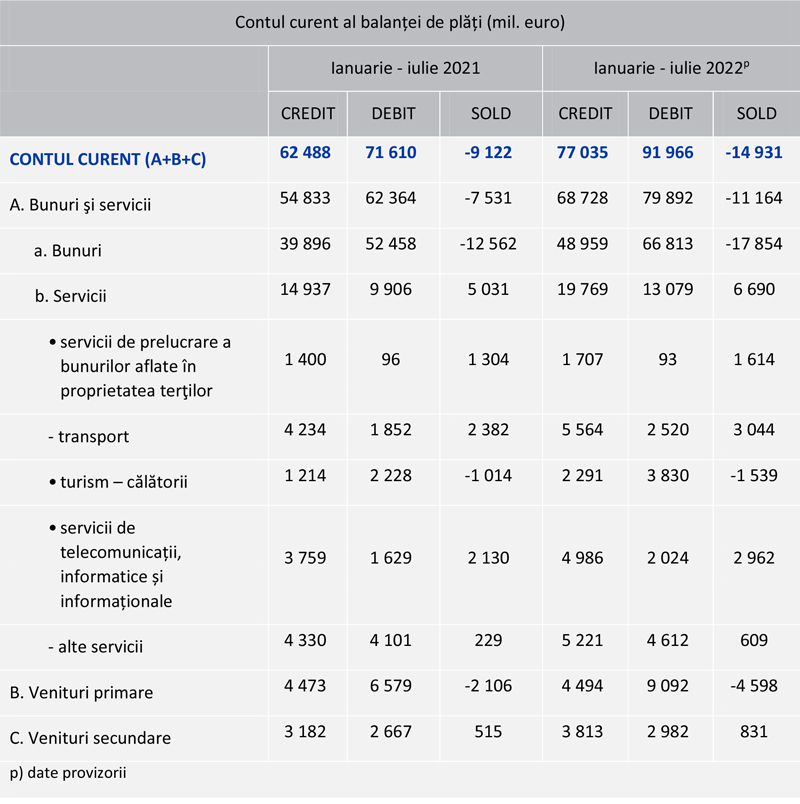 În perioada ianuarie – iulie 2022p contul curent al balanţei de plăţi a înregistrat un deficit de 14 931 milioane euro, comparativ cu 9 122 milioane euro în perioada ianuarie – iulie 2021. În structura acestuia, balanţa bunurilor a consemnat un deficit mai mare cu 5 292 milioane euro, balanța serviciilor a înregistrat un excedent mai mare cu 1 659 milioane euro, balanța veniturilor primare a înregistrat un deficit mai mare cu 2 492 milioane euro, iar balanța veniturilor secundare a înregistrat un excedent mai mare cu 316 milioane euro.