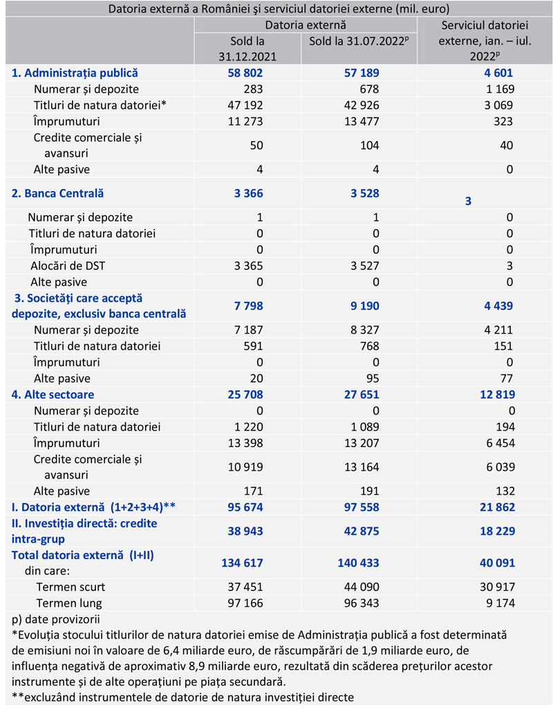 • datoria externă pe termen scurt a înregistrat la 31 iulie 2022 nivelul de 44 090 milioane euro (31,4 la sută din totalul datoriei externe), în creștere cu 17,7 la sută față de 31 decembrie 2021.
