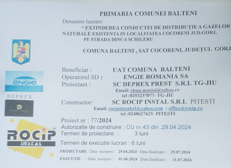 ,,Cât de curând va fi dat ordinul de începere al lucrărilor, în circa o săptămână. Întreaga investiție se face cu bani de la bugetul local și are o valoare totală de circa 11 miliarde de lei vechi cu TVA. Se va introduce rețea de gaze naturale pe ambele părți ale satului Cocoreni, respectiv și pe stânga și pe dreapta. Am ales să lucrăm cu cei de la Distrigaz Sud deoarece dânșii știu mai bine ce au de făcut și lucrarea odată demarată va fi terminată în scurt timp. Lungimea rețelei din satul Cocoreni este de 2,7 km și va deservi 202 gospodării. Ca urmare a demersurilor Primăriei Bâlteni, au fost obținute aprobările necesare și a fost semnat contractul de cofinanțare cu DISTRIGAZ SUD REȚELE S.R.L și ENGIE ROMÂNIA S.A., pentru introducere gaze în satul Cocoreni. Urmează a fi întreprinse toate demersurile pentru obținerea aprobărilor necesare și pentru satele în care nu sunt gaze. Avem atât capacitatea cât și competența pentru acestea! În ceea ce privește lucrarea de la Cocoreni, a fost executat panoul de identificare a investiției privind introducerea gazelor naturale, conform prevederilor Ordinului 63/1998 al M.L.P.A.T.”, a declarat Dumitru Scutaru, viceprimarul cu atribuții de primar al localității Bâlteni.