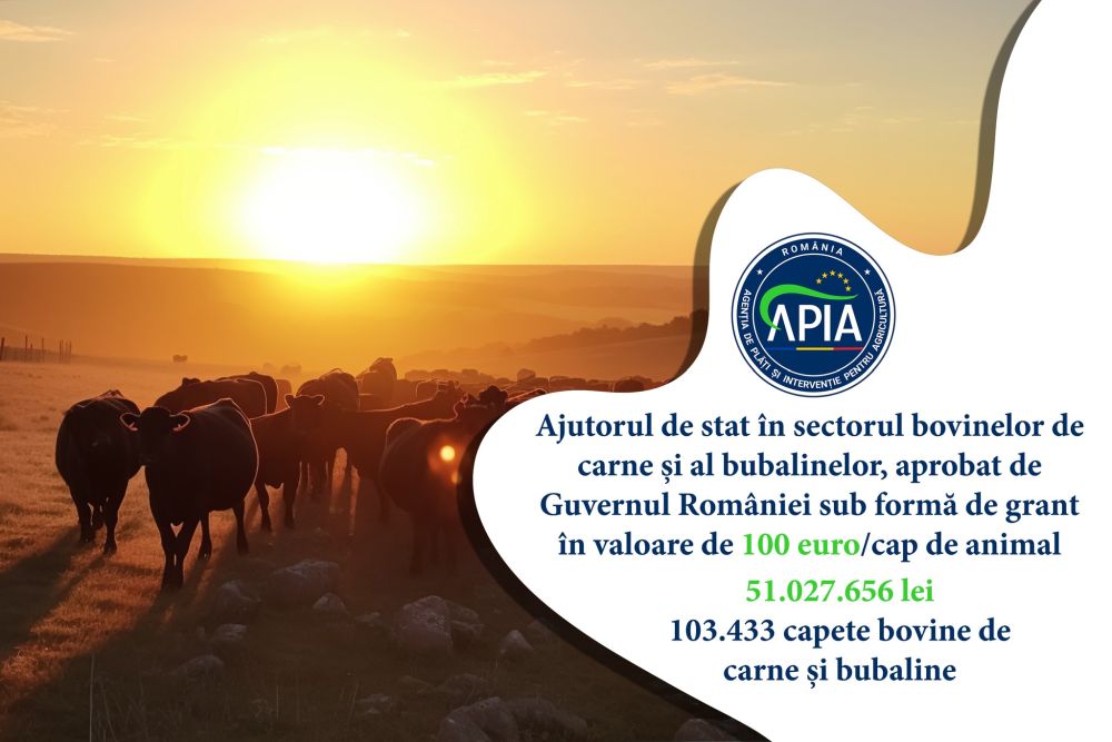 Agenția de Plăți şi Intervenție pentru Agricultură (APIA), prin Centrele Județene, efectuează plata aferentă ajutorului de stat în sectorul bovinelor de carne și al bubalinelor, aprobat de Guvernul României sub formă de grant în valoare de 100 euro/cap de animal. Suma plătită este în valoare de 51.027.656 lei și se acordă de la bugetul de stat, prin bugetul Ministerului Agriculturii și Dezvoltării Rurale (MADR), pentru un număr de 3.945 beneficiari care au accesat această formă de ajutor de stat și un efectiv de 103.433 capete bovine de carne și bubaline.