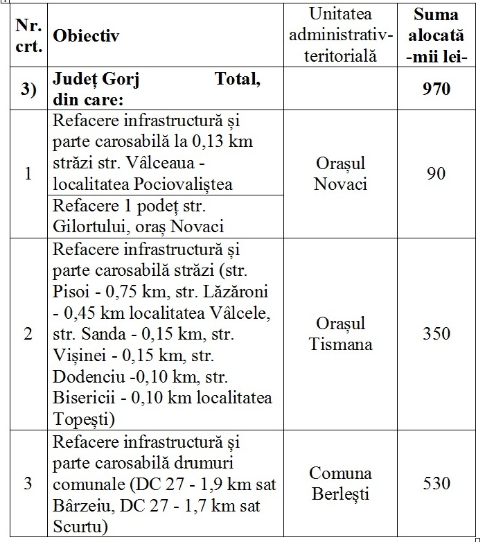 Este vorba despre comuna Berlești – 530.000 de lei, orașul Tismana – 350.000 de lei și orașul Novaci – 90.000 de lei.
