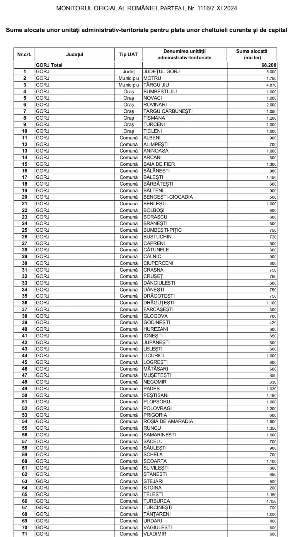 Câte 1.000.000 de lei vor ajunge în orașele Bumbești-Jiu, Novaci, Turceni și Țicleni și în comunele Aninoasa, Berlești, Licurici, Plopșoru, Samarinești și Țânțăreni.