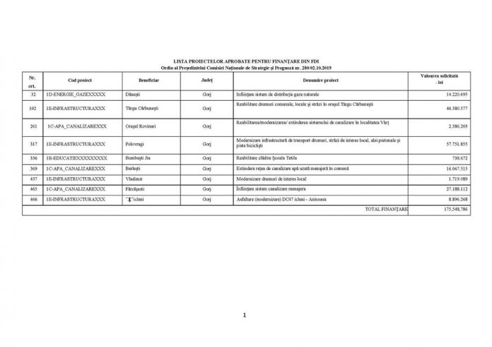 Este vorba despre investiții în orașele Rovinari, Țicleni, Bumbești Jiu și Târgu Cărbunești și comunele Dănești, Polovragi, Berlești, Vladimir și Fărcășești.