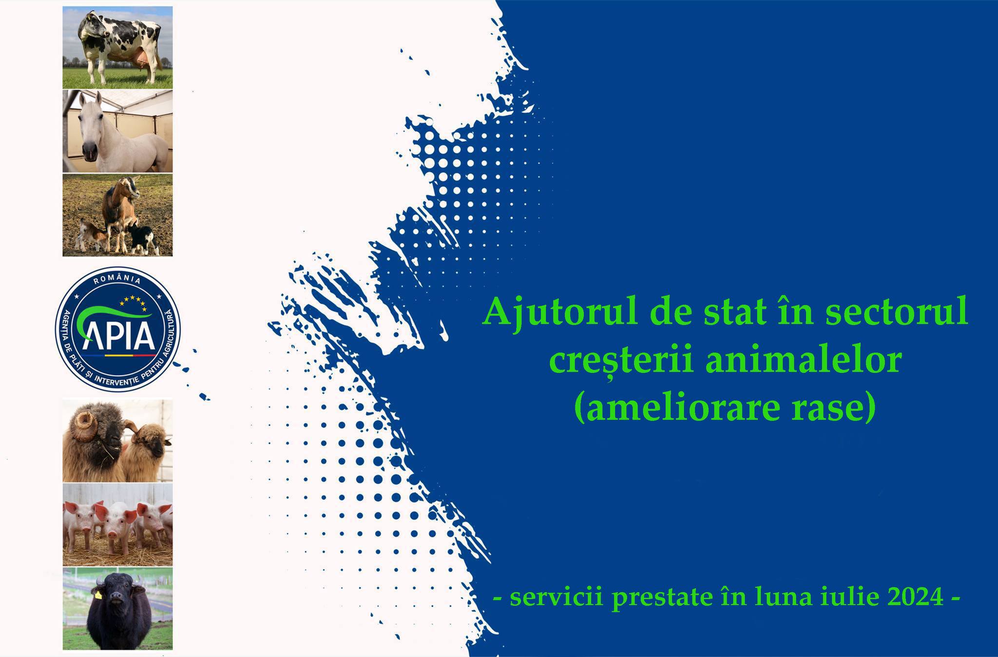Agenția de Plăți şi Intervenție pentru Agricultură (APIA), prin intermediul Centrelor Județene, a efectuat plata ajutorului de stat în sectorul creșterii animalelor (ameliorare rase), solicitat prin cererile de plată aferente serviciilor prestate în luna iulie 2024. Suma plătită este în valoare de 3.983.924,51 lei și se acordă de la bugetul de stat, prin bugetul Ministerului Agriculturii și Dezvoltării Rurale, pentru solicitanții care au accesat această formă de ajutor de stat în conformitate cu prevederile OUG nr. 61/2023 privind instituirea unei scheme de ajutor de stat în sectorul creșterii animalelor, cu modificările şi completările ulterioare.