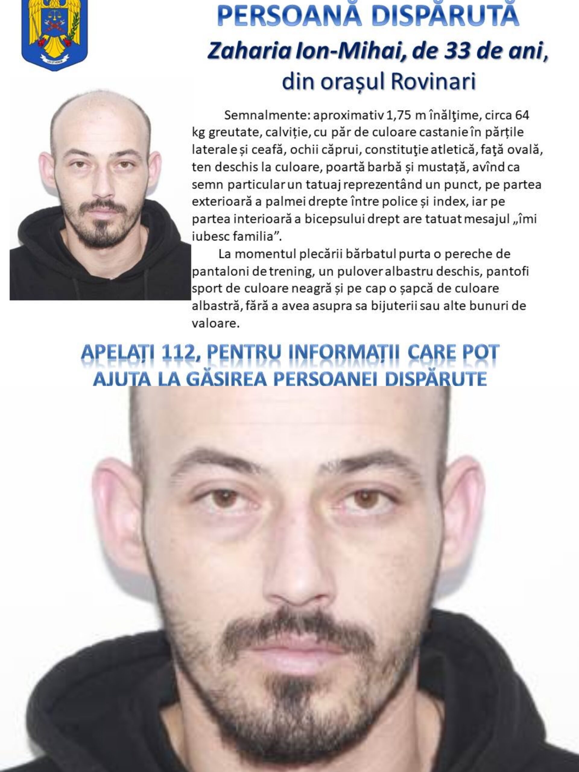 „La data 12 iunie a.c., polițiști din cadrul Poliției Orașului Rovinari au fost sesizați prin plângere, de o femeie de 55 de ani, din localitate, referitor la faptul că fiul său, Zaharia Ion-Mihai, de 33 de ani, cu același domiciliu, la data de 30.05.2024, a plecat în mod voluntar de la imobilul situat în localitatea Jumet, Belgia, unde se afla la muncă, iar până în prezent nu a mai revenit. Mama persoanei dispărute a declarat faptul că fiul său, era angajat la o societate cu obiect de activitate în domeniul construcțiilor și locuia cu mai mulți colegi de serviciu, majoritatea români, iar la data de menționată a plecat de la acel imobil într-o direcție necunoscută. La data de 03.06.2024, actul de identitate, telefonul mobil și o geacă aparținând lui Zaharia Ion-Mihai au fost găsite abandonate în apropierea locuinței, bunuri ce au rămas în posesia colegilor de serviciu”, a anunțat purtătorul de cuvânt al IPJ Gorj.