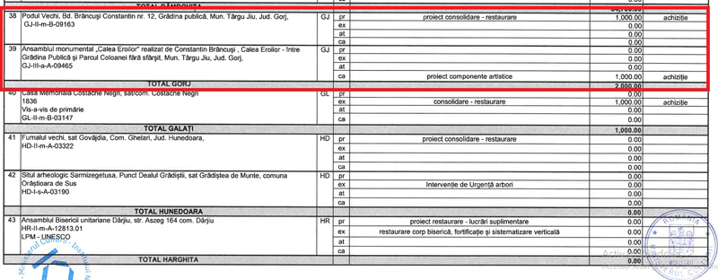 Ministerul Culturii a precizat că proiectul de conservare-restaurare a Ansamblului monumental ,,Calea Eroilor” și amplasarea celor două travee ale vechiului pod de peste Jiu, ruginite și abandonate, precum și restaurarea celor care fac legătura între Grădina Publică și insuliță, se vor realiza prin Programul Național de Restaurare, aprobat la începutul acestui an. Suma prevăzută, în ianuarie, pentru aceste două proiecte de la Târgu-Jiu a fost de 2.000 de lei. În luna septembrie însă, ministrul Culturii, Lucian Romașcanu a semnat lista cu ,,Lucrări noi – Urgențe și Priorități” în care au fost incluse și operele brâncușiene de la Târgu-Jiu, dar și podul istoric, iar sumele pentru ,,proiect component artistice”, la ,,Calea Eroilor”, respectiv ,,proiect consolidare – restaurare” Pod vechi, sunt de … 1.000 de lei pentru fiecare.