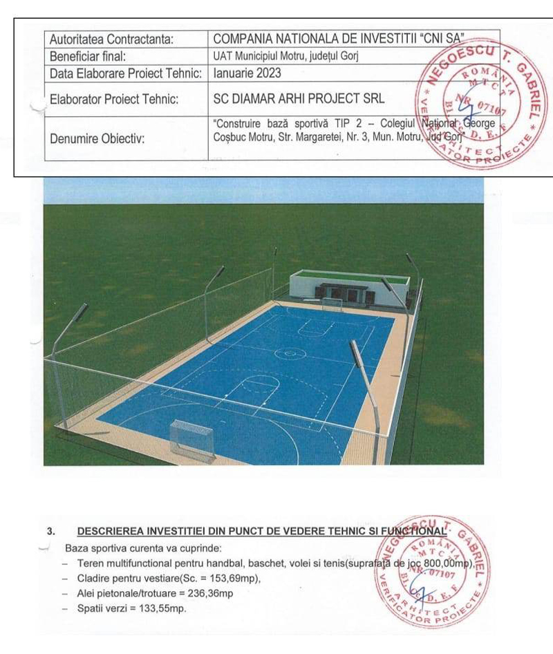 Primarul Cosmin Morega a reușit să atragă fondurile necesare pentru realizarea unei baze sportive, în municipiul Motru. Aceasta era mult așteptată de către tinerii din oraș, și nu numai, ținând cont de faptul că sportul motrean a renăscut și chiar este nevoie de astfel de baze sportive. Primăria Municipiului Motru a reușit să obțină o finanțare de peste două milioane de lei pentru realizarea unui teren multifuncțional, cu o suprafață de joc de 800 mp care va putea fi folosită pentru handbal, baschet, volei și pentru tenis. De asemenea, proiectul prevede și o clădire vestiar, ce va avea o suprafață de 153 mp. Proiectul va fi prevăzut cu alei pietonale, cu trotuare, spatii verzi și va avea o suprafață de aproape 400 mp.
