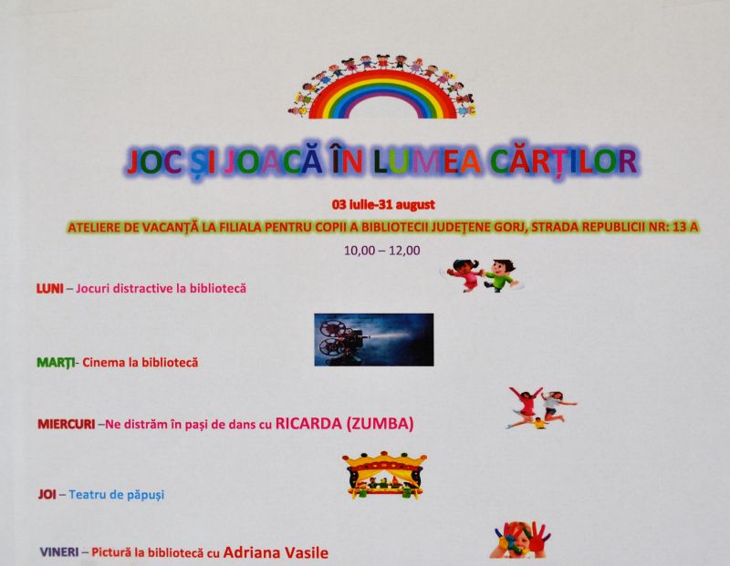 În perioada iulie – august, Biblioteca Județeana ”Christian Tell” Gorj – Filiala pentru copii organizează Atelierele de vară! Voluntarii CED Gorj vor ajuta la buna desfășurare a activităților programate. Programările se fac apelând numărul 0253215318, persoana de contact fiind bibliotecara Luiza Sandu, Filiala pentru copii. De luni, 3 iulie 2017, la Sediul Bibliotecii Județene ”Christian Tell” Gorj, pentru al cincilea an consecutiv, vor începe cursurile de limba engleză – pentru seniori, susținute de voluntarii CED Gorj.