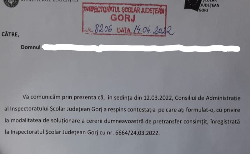Contestația depusă la Inspectoratul Școlar Județean Gorj, în urma ședinței de repartizare pentru etapa de pretransfer consimțit, legat de postul vacant de profesor de informatică la Colegiul Național Spiru Haret din Târgu-Jiu, a fost respinsă! Inspectoratul Școlar Gorj a considerat, astfel, că postul de profesor de informatică trebuie ocupat de către directorul Liceului Tehnologic ,,Ion Mincu”, din Târgu-Jiu, Leontin Hăinaru care ceruse un transfer pe acest post din motive medicale. În ciuda respingeri contestație, IȘJ, la cererea Gorjeanul, a anunțat că situația este sub anchetă. IȘJ a refuzat, însă, din motive de protejare a datelor, să ofere publicației diagnosticul profesorului care a motivat transferul, deși în ședința conducerii inspectoratului s-ar fi discutat de vertij, care nu este o boala ci un simptom. Cert este că, în baza unui diagnostic pus de un medic de la Medicina Muncii, s-a constatat că solicitantul nu este apt medical pentru funcția de director de la ,,Mincu”, nici pentru fostul post de profesor de la Liceul Henri Coandă ci este apt medical pentru ,,Spiru”. În ciuda situației aberante, IȘJ Gorj a admis transferul directorului pe postul de la Colegiul Național Spiru Haret. Contestatarii s-au adresat astfel Ministerului Educației pentru a anula avizul medical eliberat pe numele lui Leontin Hăinaru.