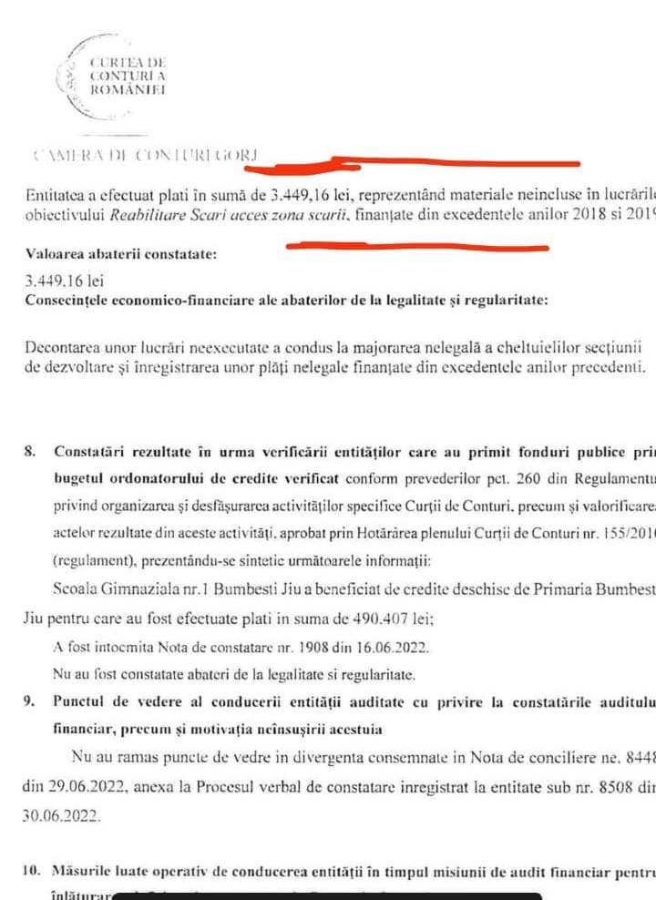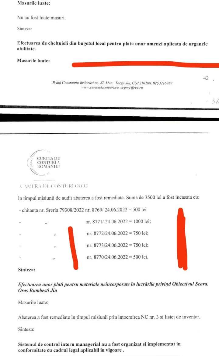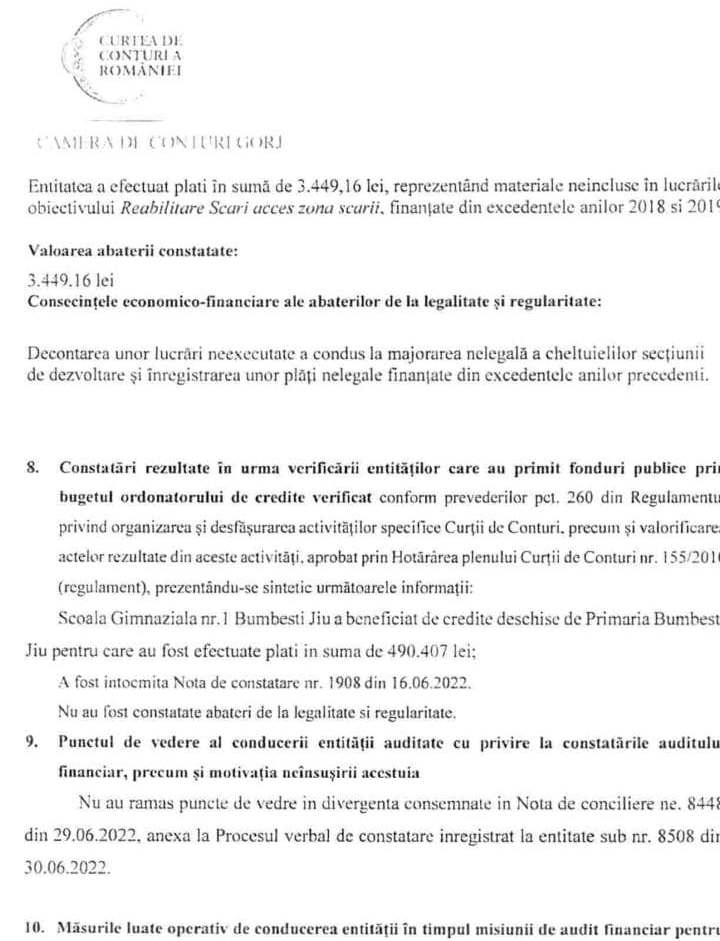 În urma auditului desfășurat la Primăria Bumbești Jiu, prejudiciul constatat de Camera de Conturi Gorj este de aproximativ 44.000 de lei, bani care trebuie recuperați în perioada imediat următoare.