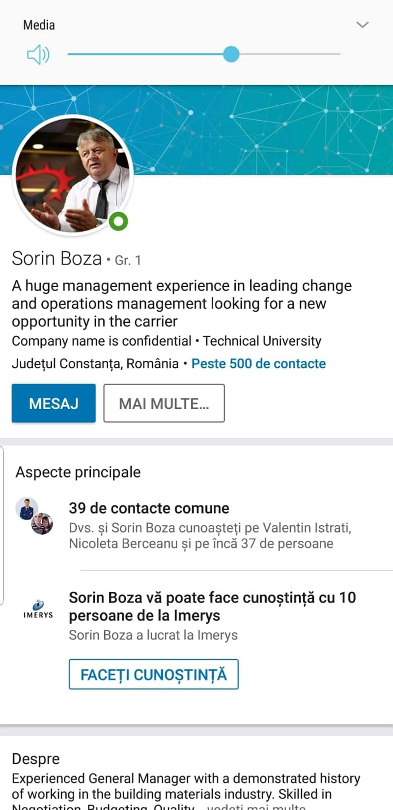 Din CV-ul publicat pe Linkedin, Sorinel Boza ne arată, în schimb, clar că nu prea are cu ce se lăuda, serviciul ocupat fiind unul de compromis, care relevă o cădere profesională ce îl rușinează. Astfel nu se explică de ce angajatorul trecut de Boza pe CV este strict secret.