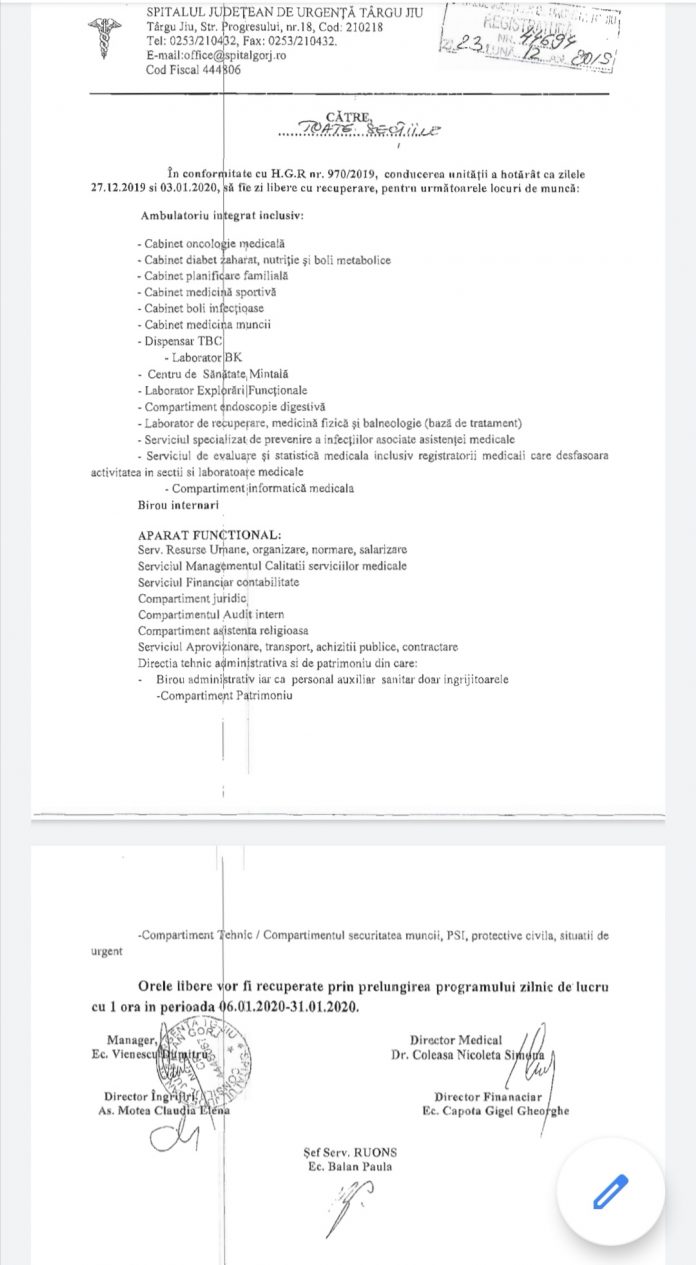 Cabinete din Spitalul Târgu Jiu, închise pe 27 decembrie și 3 ianuarie