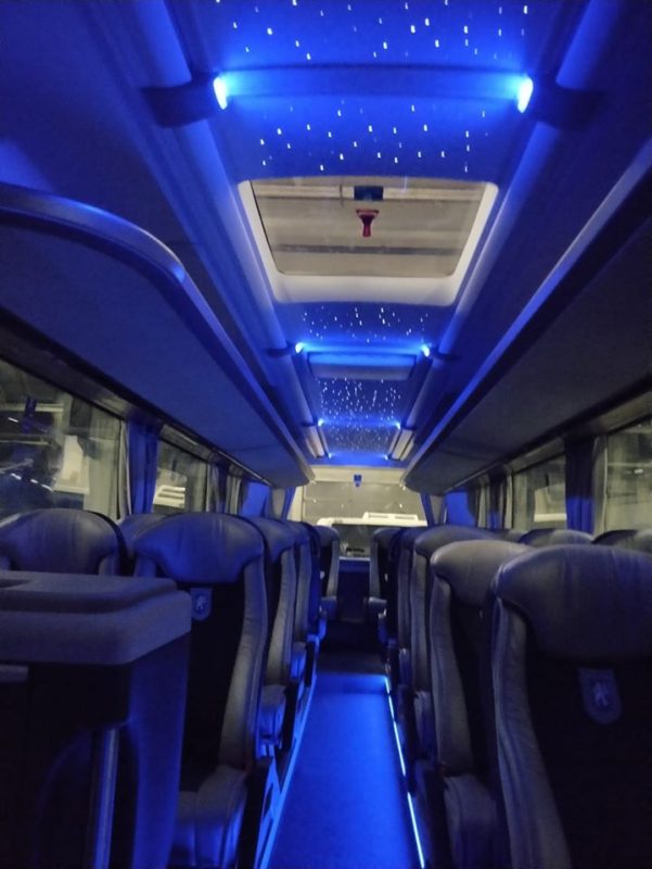 Noul autocar model Setra, evaluat la câteva sute de mii de euro, a fost deja colantat în culorile Științei. La interior, luminile ambientale sunt albastre, iar pe scaune a fost brodată sigla Universității.