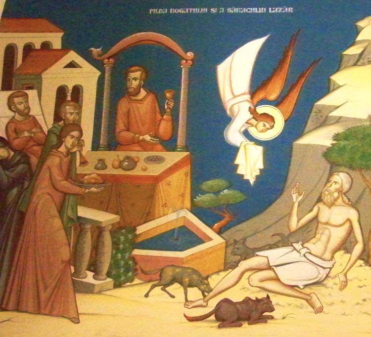 «Era un om bogat care se îmbrăca în porfiră și în vison, veselindu-se în toate zilele în chip strălucit. Iar un sărac, anume Lazăr, zăcea înaintea porții lui, plin de bube, poftind să se sature din cele ce cădeau de la masa bogatului; dar și câinii venind, lingeau bubele lui».