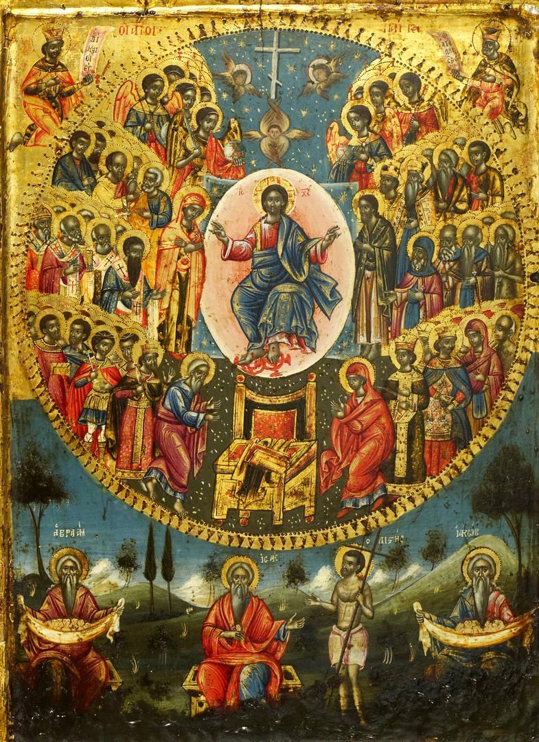 În Duminica întâi după Rusalii (a Tuturor Sfinţilor); Ap. Evrei 11, 33-40; 12, 1-2; Ev. Matei 10, 32-33; 37-38 şi 19, 27-30 (Urmarea lui Hristos); Sf. Ap. Iuda, rudenia Domnului; Sf. Cuv. Paisie cel Mare (Lăsatul secului pentru Postul Sf. Ap. Petru şi Pavel), la Sfânta şi Dumnezeiasca Liturghie, slujba oficiată în Biserica Ortodoxă Română face pomenirea tuturor sfinților, fiindcă Biserica ne cere să pomenim toți sfinții care sunt «prietenii» lui Dumnezeu, ocrotitorii de obşte și îndrumătorii noștri care sunt pomeniți imediat după Rusalii şi pentru că sfințenia este opera Duhului Sfânt. Sfinții sunt considerați toți cei care sunt în stare de harul prin care au ajuns la sfinţenie și au intrat în marea familie a «vaselor alese» ale lui Dumnezeu, iar, «Duminica tuturor sfinților» este sărbătoarea tuturor celor care sunt în Împărăția lui Dumnezeu și care alcătuiesc împreună o adevărată și minunată familie în comuniune cu Mântuitorul Iisus Hristos. Împărăţia cerurilor înseamnă şi participarea sfinţilor la fericirea veșnică a lui Dumnezeu, fiindcă Iisus Hristos vorbește despre Cer ca fiind Împărăția lui Dumnezeu sau ca despre o casă unde Tatăl ceresc își adună copiii, ca la un praznic împărătesc unde toți invitații sunt chemați să fie împreună, în comuniune. A fi împreună cu Dumnezeu este fericirea absolută într-o viaţă veşnică şi fără dureri, fără griji, fără spaime, cu toate dorințele împlinite, fiind sensibilizaţi de faptul că Dumnezeu este Tatăl nostru și El ne-a făcut fiii Săi, iar sfinții din Cer sunt frații noștri care ne așteaptă pe toți să ne regăsim printre ei! Sfinţii alcătuiesc o comuniune uriașă al cărui număr nimeni nu-l cunoaște, iar, dacă se reunește la această sărbătoare veșnică din preajma Tatălui, comuniunea devine ea însăşi o mulțime alcătuită din toate națiile, rasele, popoarele și limbile pământului! Desigur, în fruntea acestei mulțimi se află Mântuitorul nostru Iisus Hristos, căruia I se alătură toți cei care I-au urmat, în primul rând Sfânta Fecioară Maria, Maica Domnului și a noastră a tuturor, Împărăteasa Cerului și a Pământului, iar, lor li se adaugă şi apostolii, martirii și evangheliștii, mărturisitorii, asceții, ierarhii și toți cei ce au murit în drepta credință: episcopi, preoți, monahi și monahii, tați și mame, tineri și copii, cei cu inimă curată, făcătorii de pace, cei smeriți, cei săraci cu duhul, cei blânzi, cei ce plâng, toți cei care sunt spălați și curățați prin sângele Mielului, aşa cum ne spune «Apocalipsa» (7, 14), iar, Dumnezeu ne îndeamnă mereu să căutăm sfințenia şi în viața sfinţilor de fiecare zi, în credința față de Hristos și în Evanghelie, în împlinirea smerită a rugăciunilor noastre!