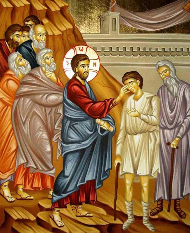 Aşadar, în Duminica a 7-a după Rusalii, vom asculta citirea Sfintei Evanghelii de la Sf. Ev. Matei: «În vremea aceea, pe când trecea Iisus, doi orbi se țineau după El, strigând şi zicând: Miluieşte-ne pe noi, Fiule al lui David! Iar după ce a intrat în casă, au venit la El orbii şi Iisus i-a întrebat: ,,Credeţi că pot să fac Eu aceasta”? Zis-au Lui: Da, Doamne! Atunci S-a atins de ochii lor, zicând: ,,După credinţa voastră, fie vouă”! Şi s-au deschis ochii lor. Iar Iisus le-a poruncit cu asprime, zicând: ,,Vedeţi, nimeni să nu ştie”! Dar ei, ieşind, L-au vestit în tot ținutul acela. Și, plecând ei, iată au adus la El un om mut, având demon. Şi, fiind scos demonul, mutul a grăit. Iar mulţimile se minunau, zicând: Niciodată nu s-a văzut aşa ceva în Israel. Dar fariseii ziceau: Cu domnul demonilor scoate pe demoni. Şi Iisus străbătea toate cetățile şi satele, învăţând în sinagogile lor, propovăduind Evanghelia Împărăţiei şi vindecând toată boala şi toată neputinţa în popor» (Mt.9,27-35).Prin urmare, cei doi orbi care stăteau şi cerşeau în apropiere de oraşul Ierihon, nu Îl puteau vedea pe Iisus Hristos, dar, auzeau zgomotul pe care îl producea mulţimea care venea după El, iar în inimile lor încolţea un grăunte de speranţă, pentru că alergând în urma Lui strigau din suflet şi Îl rugau: «Iisuse, Fiul lui David, miluieşte-ne pe noi!», la care, putem adăuga cuvintele: Am auzit, Doamne, că ai făcut atâtea minuni, noi nu te vedem cu ochii trupeşti, dar îţi simţim puterea, bunătatea, mila şi iubirea dumnezeiască, de aceea te rugăm, ajută-ne, dă-ne lumina ochilor! Însă, Domnul Iisus Hristos, ca să se încredinţeze de statornicia credinţei orbilor, la început nu le-a răspuns nici un cuvânt, ci şi-a urmat calea spre casa unde avea obicei să-şi «plece capul», dar, orbii nu s-au descurajat, ci L-au urmat, intrând în casă. Domnul Iisus, văzând dorinţa lor, i-a întrebat: „Credeţi voi că eu pot să fac aceasta?”, adică, să-i facă sănătoşi! Deci, e bine să ne întrebăm: Oare, de ce Mântuitorul le-a pus această întrebare? Doar El este cunoscătorul inimilor şi al gândurilor noastre, însă, El i-a întrebat, ca să cunoască toţi credincioşii, dintotdeauna, că fără o credinţă vie şi adevărată, nu primim harul pe care îl dorim de la Bunul Dumnezeu! Aşadar, Domnul Iisus Hristos cere şi de la aceşti doi orbi, ca şi de la alţii, pe care i-a vindecat, ca şi de la noi toţi care Îl mărturisim, cere credinţă, ca în acest fel să arate puterea cea mai presus de fire a credinţei! Cei doi orbi, fără să zăbovească prea mult, au răspuns la întrebarea Mântuitorului: «Da, Doamne!», iar, atunci El S-a atins de ochii lor, zicându-le: „După credinţa voastră, fie vouă!” şi s-au deschis ochii lor” (Mat. 9, 29). Să fim înţeleşi pe deplin, o dată cu vederea ochilor trupeşti, pe care au câştigat-o, prin atingerea lui Iisus, ei au primit acum şi vederea lăuntrică a ochilor sufleteşti, cu toată atenţionarea Lui Iisus, de a nu face cunoscută minunea aceasta nimănui, astfel că bucuria şi fericirea vederii îi fac pe cei doi să răspândească numele lui Iisus în tot locul acela! Nicicând nu se poate ascunde lumina vindecării dumnzeieşti! Oare, cum ar putea să tacă acei care au primit în ei, o dată cu lumina materială şi lumina cunoaşterii şi premăririi Lui Dumnezeu? Dumnezeu vrea ca omul să vadă cu ochii credinţei, de aceea i-a dăruit acest minunat simţ al văzului, dar El vrea ca acelaşi om să se înalţe de la vederea celor pământeşti, la cunoaşterea şi înţelegerea celor cereşti, de la făptură la Creator!