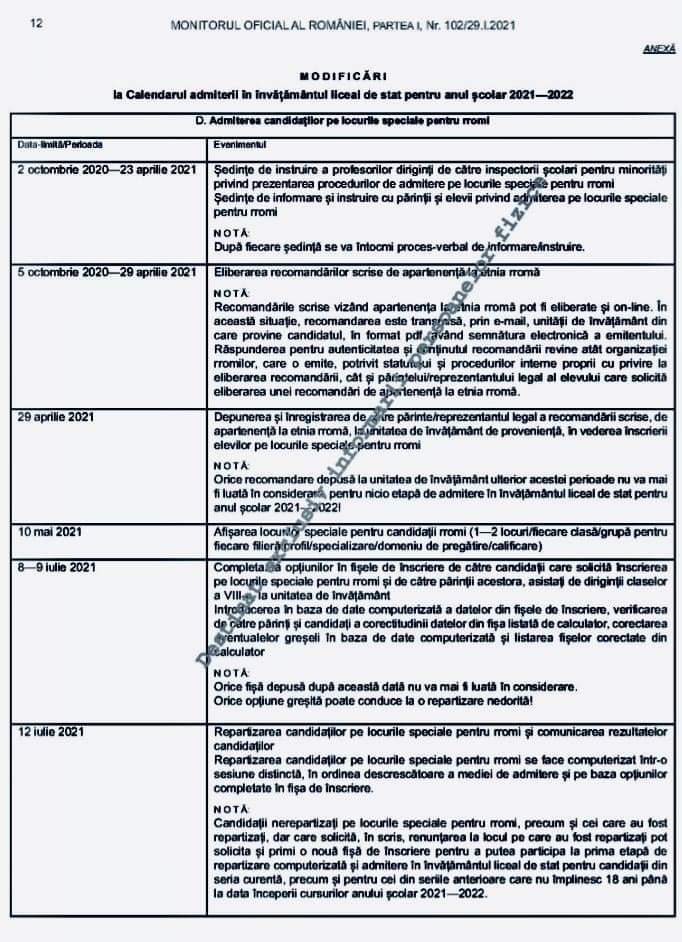 Prin Ordinul Ministerului Educației, nr. 3203/28.01.2021, a fost modificat calendarul admiterii în învățământul liceal de stat pentru anul școlar 2021-2022, privind perioada de eliberare a recomandărilor vizând apartenența elevilor la etnia romă. Astfel, conform noului calendar, aceste recomandări pot fi depuse la unitățile de învățământ unde sunt înscriși în prezent elevii până la data de 29 aprilie 2021.
