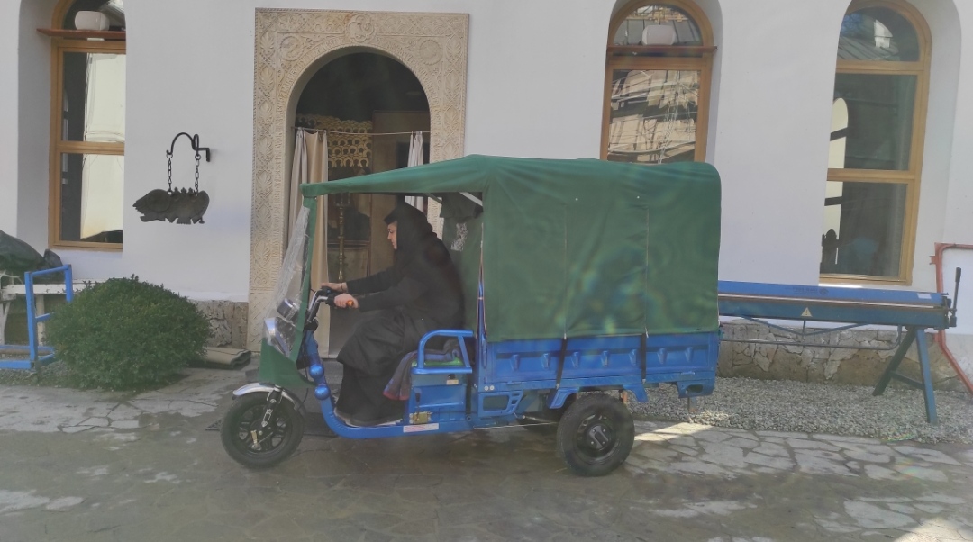 Călugărițele de la Mănăstirea Tismana, obiectiv aflat într-un amplu proces de modernizare și restaurare, se deplasează cu un mijloc de transport care consumă puțin, este electric și ecologic.