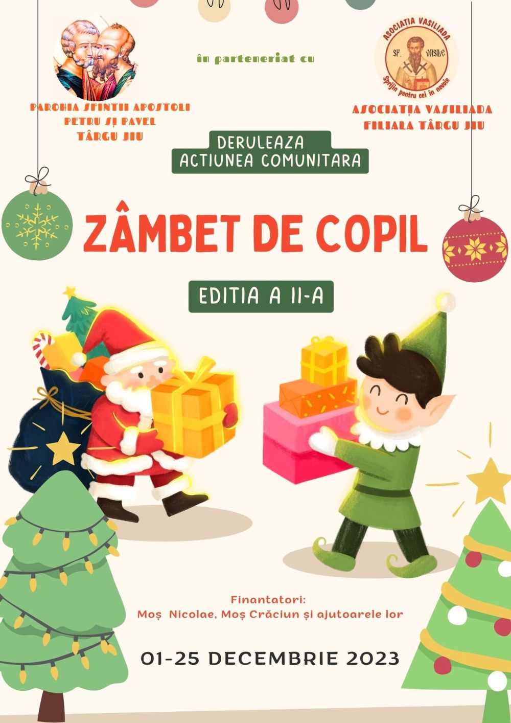 Parohia “Sfinții Apostoli Petru și Pavel”, în parteneriat cu filiala Târgu Jiu a Asociației VASILIADA, a organizat în luna decembrie a anului 2023 ediția a II-a a campaniei umanitară “ZÂMBET DE COPIL”.