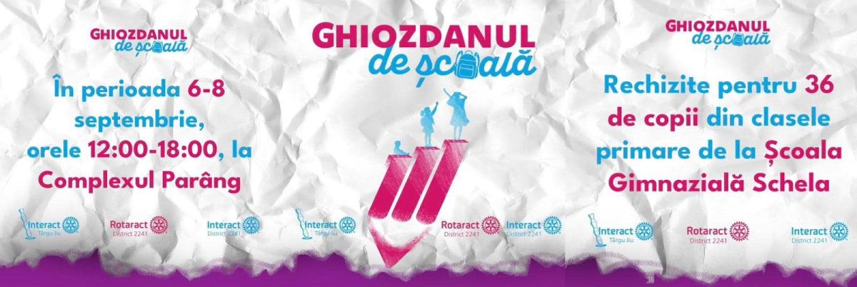 Clubul Interact Târgu Jiu demarează proiectul ,,GHIOZDANUL PENTRU ȘCOALĂ”, o activitate menită sa vină în sprijinul a 36 de elevi din clasele primare ale Școlii Gimnaziale din localitatea Schela, județul Gorj. Acești elevi vor fi sprijiniți, la începerea noului an școlar 2024-2025, prin acordarea de ghiozdane cu toate rechizitele școlare necesare unui elev, la început de drum.