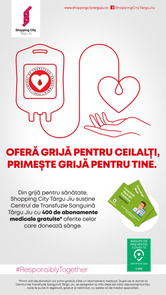 Campania se va încheia la finele lunii iunie, iar donatorii vor fi răsplătiți cu un abonament medical de către reprezentanții Shopping City Mall. ,,Știai că România este printre ultimele locuri la numărul de donatori? Împreună cu Centrul de Transfuzie Sanguină Târgu-Jiu, te încurajăm să faci o faptă bună și să donezi sânge pentru cei care au atâta nevoie de el. Cu o singură donare îi ajuți pe pacienții din spitalele județului Gorj să primească o șansă la sănătate și viață. Noi îți mulțumim pentru implicare și te felicităm că ești un exemplu pentru cei din jur cu un beneficiu suplimentar, pe lângă toate drepturile pe care le ai după ce donezi sânge. Vino la Info Desk Shopping City Târgu-Jiu cu adeverința de donator eliberată de Centrul de Transfuzie Sanguină Târgu-Jiu și te recompensăm pe loc cu un abonament medical valabil 3 luni. În baza abonamentului de telemedicină, tu și familia ta veți beneficia de acces gratuit și nelimitat la consultații prin telefon la peste 40 de medici specialiști. Campania este valabilă până pe 30 iunie 2021 sau până la epuizarea celor 400 de abonamente medicale. Implicându-te pentru ceilalți îți faci un mare bine și ție. După donare, sângele este împrospătat, imunitatea organismului creşte, iar riscul de paralizie şi accident vascular se reduce cu 30%”, au transmis organizatorii campaniei.
