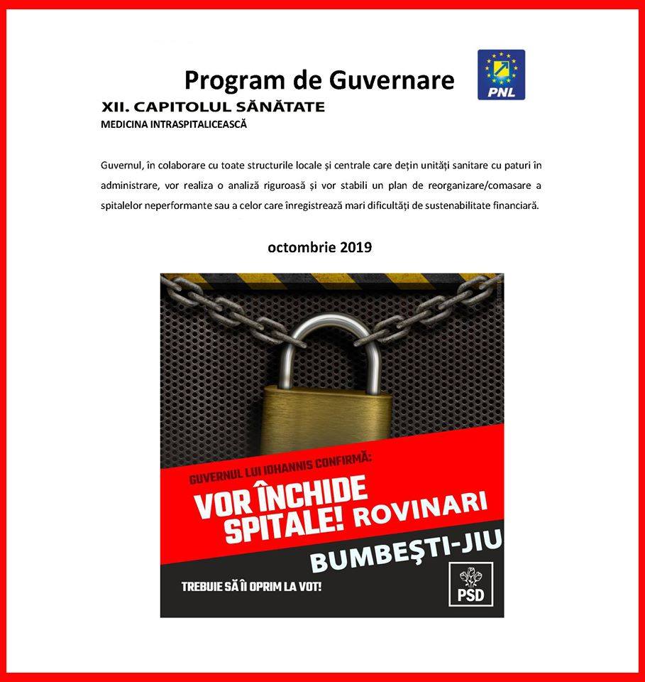„Noul guvern al PNL anunță închiderea și comasarea spitalelor. Programul de guvernare al PNL precizează în scris, negru pe alb, că se va stabili un plan de reorganizare și comasare a spitalelor, fără să se țină cont de beneficiarii acestor servicii, românii, dar nici de investițiile realizate în ultimii ani în aceste spitale. În județul Gorj se vehiculează închiderea spitalelor din Rovinari și Bumbești-Jiu. Eu nu-mi doresc ca românii să mai treacă prin starea de îngrijorare și disperare, ca în 2010, când aceiași oameni, aflați acum în PNL, au tăiat pensii și salarii, au închis școli, au comasat și închis spitale”, a postat, pe o rețea de socializare, liderul PSD Gorj, deputatul Mihai Weber.