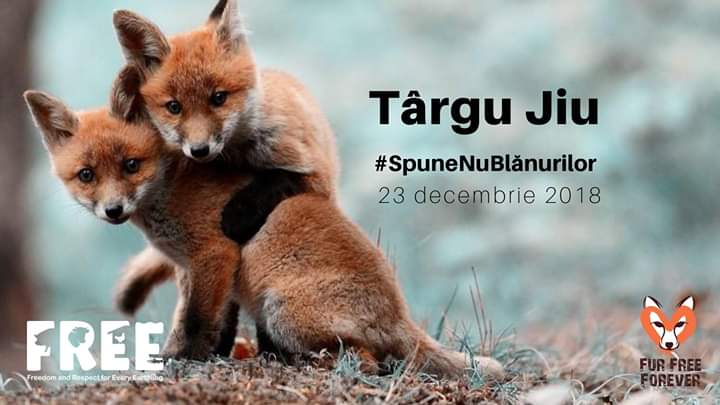 Asociaţia Free organizează mâine, 23 decembrie, de la ora 16.00, în Piaţa Prefecturii din municipiul Târgu Jiu, evenimentul „Spune Nu Blănurilor“. Manifestarea se dorește a fi una de informare a publicului în legătură cu industria blănurilor. La eveniment sunt aşteptaţi toţi iubitorii de animale din Târgu Jiu, judeţul Gorj şi nu numai.