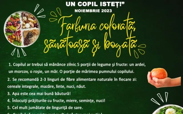 Ministerul Sănătăţii, cu sprijinul Institutului Naţional de Sănătate Publică şi al Direcţiilor de sănătate publică, desfăşoară pe parcursul lunii noiembrie campania „Ce, cât şi cum mănâncă un copil isteţ” privind principiile unei alimentaţii sănătoase la vârsta şcolară care se adresează copiilor din ciclul primar de învăţământ, părinţilor acestora şi cadrelor didactice.