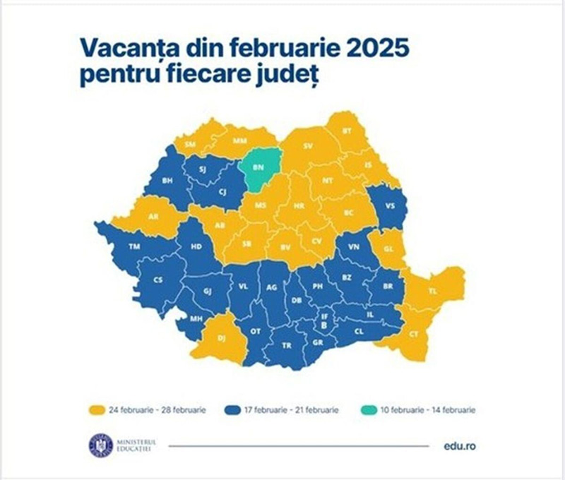 Alte 18 județe au decis să își programeze vacanța în săptămâna 24-28 februarie 2025, iar județul Bistrița-Năsăud este singurul care a optat pentru o vacanță în perioada 10-14 februarie 2025. Anul școlar va începe pe 9 septembrie 2024 și este structurat în cinci module de cursuri și tot atâtea perioade de vacanță. Pentru anul școlar 2024-2025, au fost menținute și programele naționale „Școala Altfel” și „Săptămâna verde”, care se vor desfășura între 9 septembrie 2024 și 30 mai 2025. Aceste programe vor fi implementate pe parcursul a cinci zile lucrătoare consecutive, iar planificarea acestora va fi decisă de fiecare unitate de învățământ în parte, în funcție de specificul și prioritățile locale, potrivit Ministerului Educației.