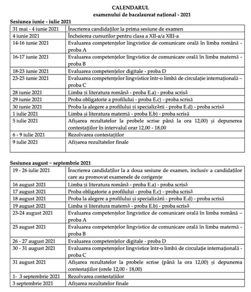 Înscrierile la prima sesiune a examenului se Bacalaureat vor debuta la sfârșitul acestei luni, pe 31 mai, și se vor încheia pe 4 iunie. Probele vor începe pe 14 iunie și se vor desfășura conform următorului calendar: 14 – 16 iunie 2021 – evaluarea competenţelor lingvistice de comunicare orală în limba română, 16 – 17 iunie 2021 – evaluarea competenţelor lingvistice de comunicare orală în limba maternă, 18 – 23 iunie 2021 – evaluarea competenţelor digitale, 23 – 25 iunie 2021 – evaluarea competenţelor lingvistice într-o limbă de circulaţie internaţională, 28 iunie 2021 – Limba şi literatura română – proba scrisă, 29 iunie 2021 – Proba obligatorie a profilului – proba scrisă, 30 iunie 2021 – Proba la alegere a profilului şi specializării – proba scrisă, 1 iulie 2021 – Limba şi literatura maternă – proba scrisă. Primele rezultate vor fi afișate pe 5 iulie, iar contestațiile vor fi depuse în aceeași zi. Rezultatele finale vor fi afișate pe 9 iulie. O a doua sesiune a examenului se va desfășura în luna august. Ministerul Educației a anunțat că nu va mai fi organizată și o sesiune specială a Bacalaureatului.