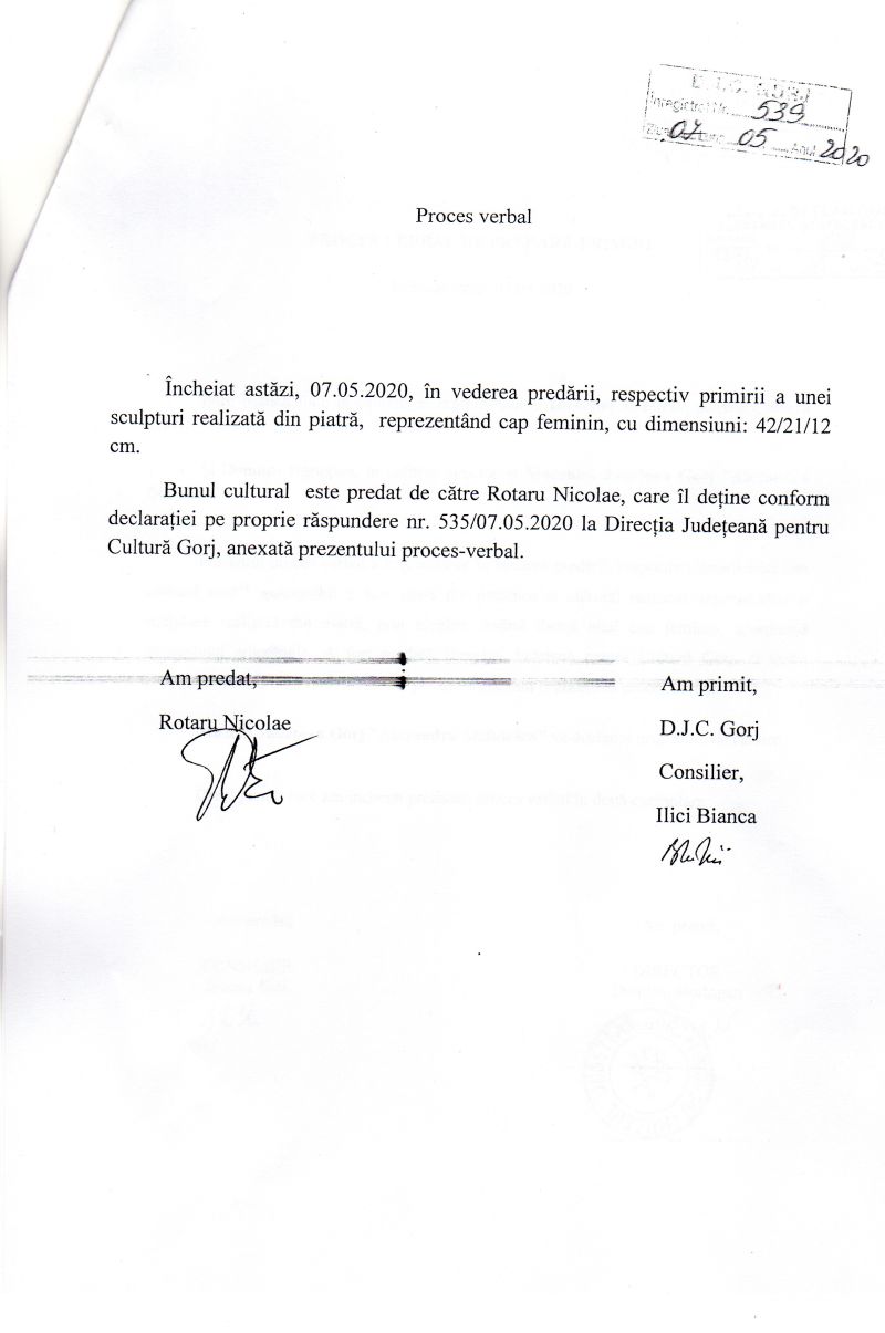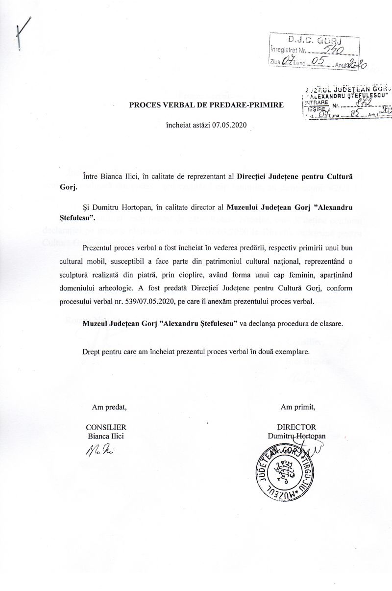 Șeful Secției de Istorie a Muzeului Al. Ștefulescu, muzeograful Titu Zamfiroiu, a precizat că, capul de statuie a fost predat instituției de cultură. De fapt, a ajuns la Muzeu dinspre Direcția de Cultură Gorj.