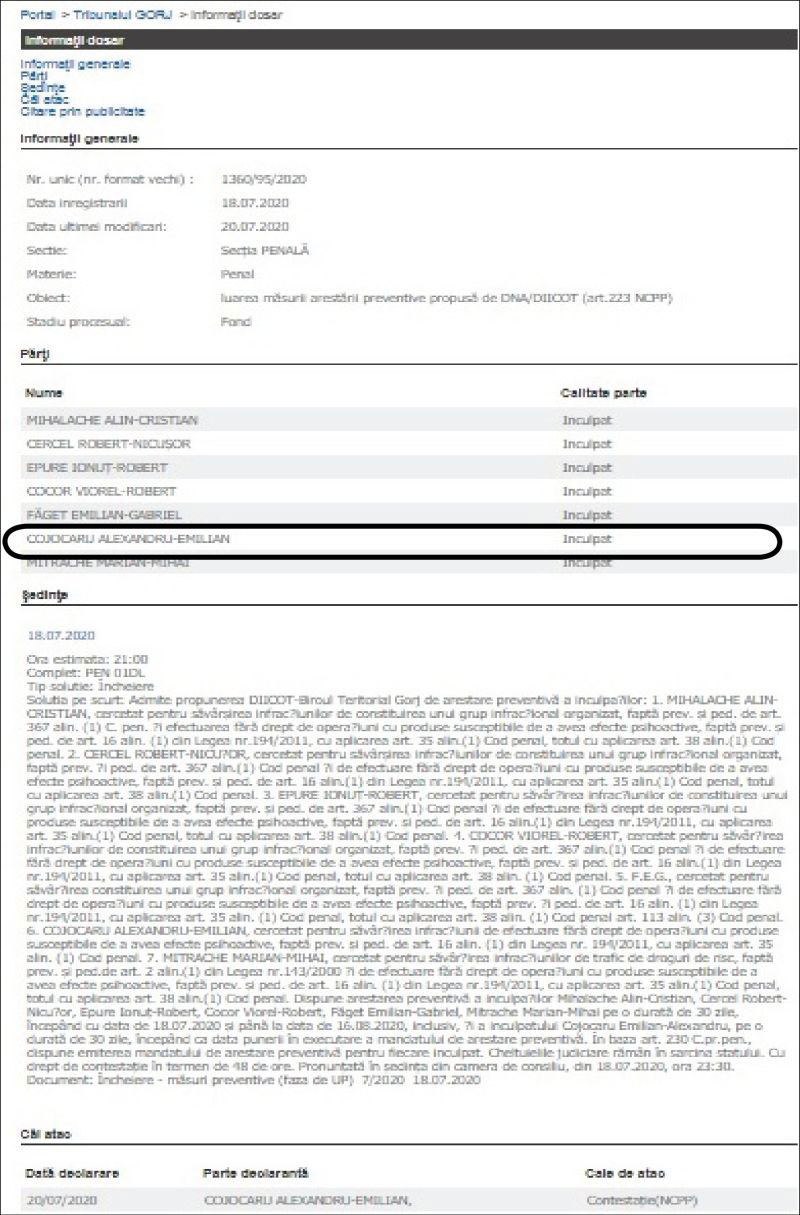 ,,Dispune arestarea preventivă a inculpatului C.E.A., pe o durată de 30 zile, începând ca data punerii în executare a mandatului de arestare preventivă”, este decizia contestată. Verdictul va fi stabilit la Curtea de Apel Craiova.Cei șapte bărbați au fost reținuți în urma celor 12 percheziții făcute, vineri, în Gorj, Dolj și Argeș. ,,În cauză s-a reținut faptul că, de la începutul anului 2020, inculpatul M.A.C. a inițiat și a constituit, în municipiul Târgu-Jiu, împreună cu alte persoane, un grup infracțional organizat, în scopul săvârșirii infracțiunii de efectuare fără drept de operațiuni cu produse susceptibile de a avea efecte psihoactive. În concret, inculpatul M.A.C. coordona activitatea grupului infracțional organizat, ai căror membri efectuau deplasări la intervale regulate de timp, pe raza municipiului Craiova, de unde achiziționau diverse cantități de produse susceptibile de a avea efecte psihoactive de la inculpatul C.A.E..După procurarea produselor susceptibile de a avea efecte psihoactive, acestea erau transportate în municipiul Târgu-Jiu, porționate, ambalate și vândute în schimbul sumei de 50 de lei/pachețel, la diverși consumatori de pe raza județului Gorj și a municipiului Târgu-Jiu, cu preponderență adolescenți. În cadrul grupului infracțional organizat, o parte dintre membri se ocupau cu vânzarea cu produse susceptibile de a avea efecte psihoactive către diverși consumatori, tranzacțiile efectuându-se cu preponderență în cartierul 9 Mai și în imediata apropiere a unui liceu din municipiul Târgu-Jiu”, se precizează într-un comunicat al DIICOT Gorj